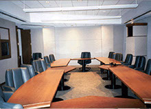 CEO Presentation Room with 10 Channel Lexicon Surround Sound, Crestron Remote, Custom Table and Control Podium with Rear Projection Presentation Booth.